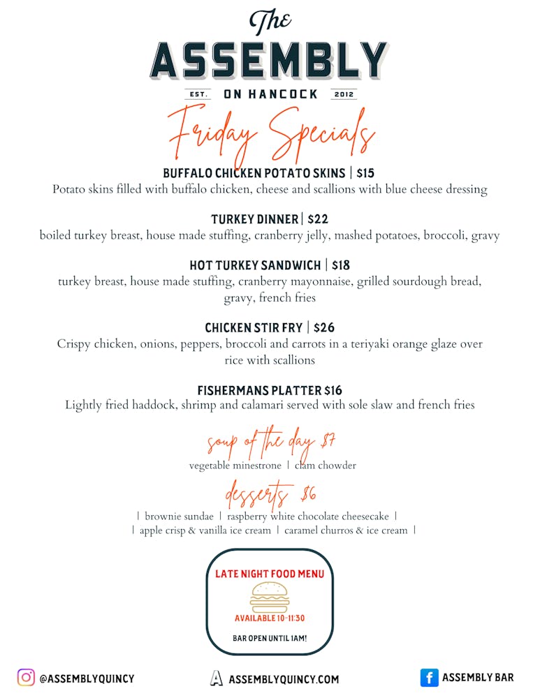 Late Night Menu Available Friday and Saturday Night 10pm-11:30pm